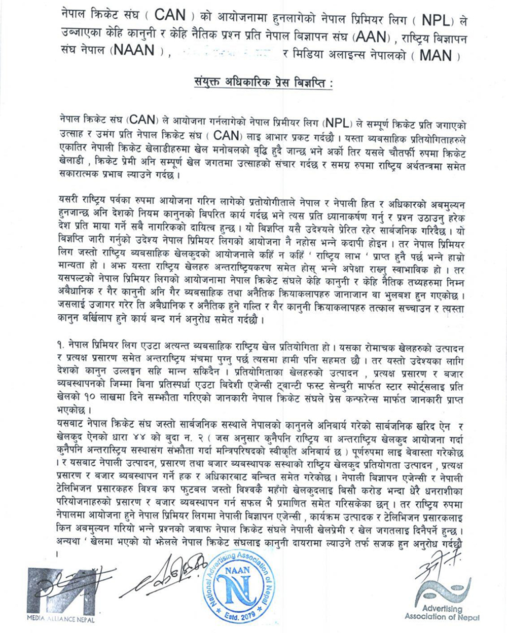 मंगलबार नेपाल विज्ञापन संघ, राष्ट्रिय विज्ञापन संघ नेपाल र मिडिया अलाइन्सले संयुक्त विज्ञप्ति जारी गर्दै क्यानले एनपीएलको प्रशारण स्टार स्पोर्ट्सबाट गर्ने सम्झौता अवैधानिक भएको भन्दै सच्याउन चेतावनी दिएका छन् ।