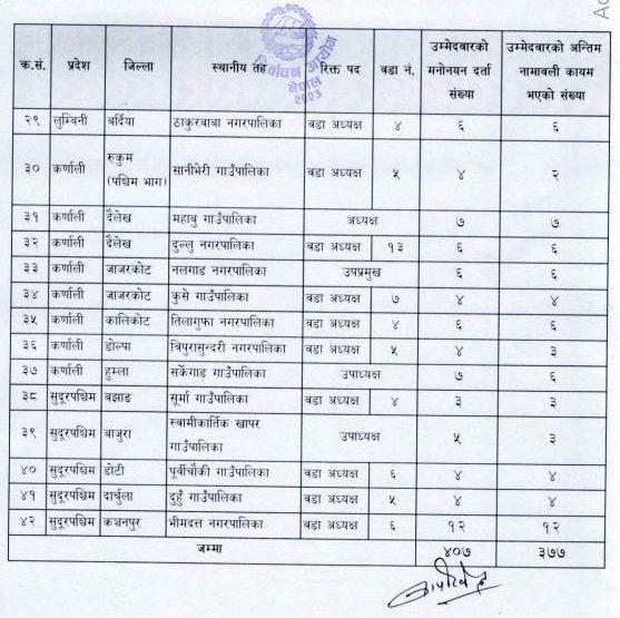 आयोगले जिल्ला समन्वय समिति, नगरपालिका र गाउँपालिकाको प्रमुख, उपप्रमुख तथा अध्यक्ष, उपाध्यक्ष र वडा अध्यक्षका लागि उम्मेदवारी दिएका ४१० जनामध्ये ३ जना निर्विरोध निर्वाचित भएको र ३१ जनाले उम्मेदवारी फिर्ता लिएपछि ३७६ जना उम्मेदवारको अन्तिम नामावली प्रकाशन गरेको हो।