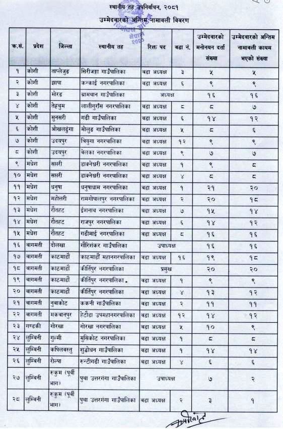 आयोगले जिल्ला समन्वय समिति, नगरपालिका र गाउँपालिकाको प्रमुख, उपप्रमुख तथा अध्यक्ष, उपाध्यक्ष र वडा अध्यक्षका लागि उम्मेदवारी दिएका ४१० जनामध्ये ३ जना निर्विरोध निर्वाचित भएको र ३१ जनाले उम्मेदवारी फिर्ता लिएपछि ३७६ जना उम्मेदवारको अन्तिम नामावली प्रकाशन गरेको हो।