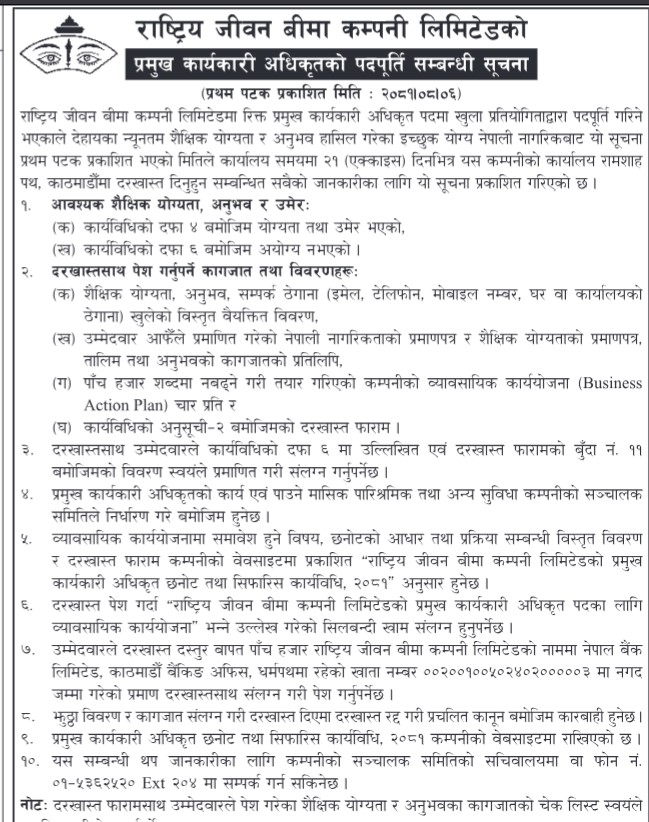 काठमाडौं। राष्ट्रिय जीवन बिमा कम्पनीको प्रमुख कार्यकारी अधिकृत (सीइओ) पदका लागि पुन आवेदन माग भएको छ।