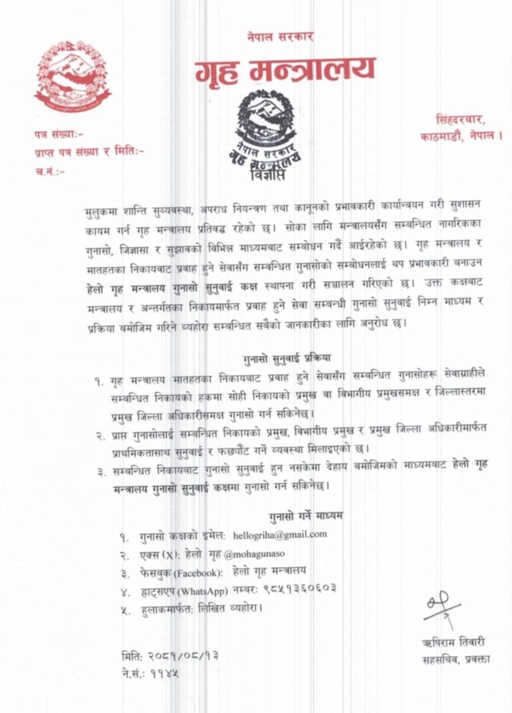 मन्त्रालयले बिहीबार प्रेस विज्ञप्ती जारी गरी मुलुकको शान्ति सुव्यवस्था, अपराध नियन्त्रण तथा कानुनको प्रभावकारी कार्यान्वयन गरी सुशासन कायम गर्न मन्त्रालय प्रतिवद्ध रहेको जनाउँदै त्यसका लागि मन्त्रालयसित सम्बन्धीत नागरिकका गुनासो, जिज्ञासा र सुझावको विभिन्न माध्यमबाट सम्बोधन गर्दै आएको जनाएको हो।