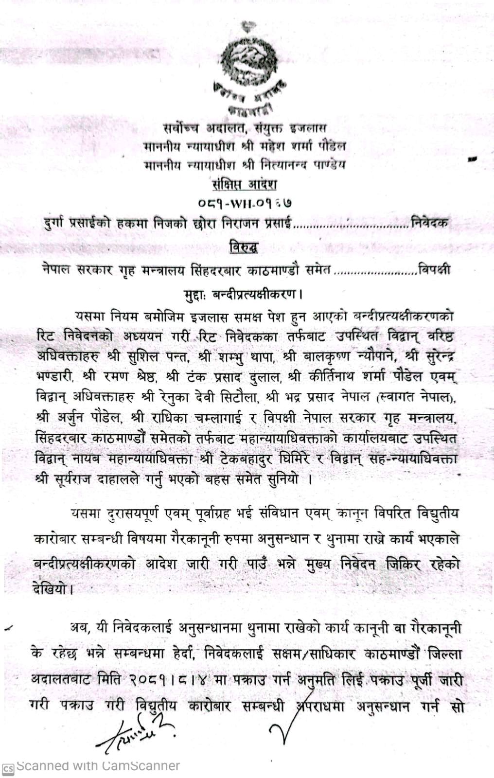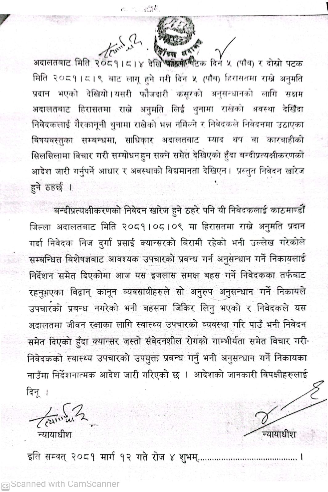 बन्दी प्रत्यक्षीकरणको निवेदन खारेज गर्दै सर्वोच्च न्यायाधीश महेश शर्मा र नित्यानन्द पाण्डेयको इजलासले बुधबार उनी क्यान्सर जस्तो संवेदनशील रोगको बिरामी भएकाले उपचारको व्यवस्था व्यवस्था मिलाउन आदेश दिएको हो।