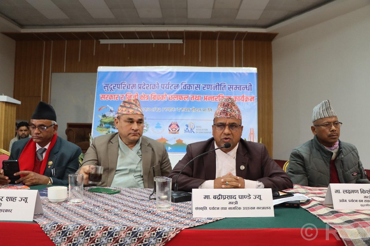 सुदूरपश्चिम । संस्कृति, पर्यटन तथा नागरिक उड्डयनमन्त्री बद्रीप्रसाद पाण्डेले सरकार र निजी क्षेत्रको संयुक्त प्रयासमा पर्यटन क्षेत्रको विकास गर्न सकिने बताएका छन्।