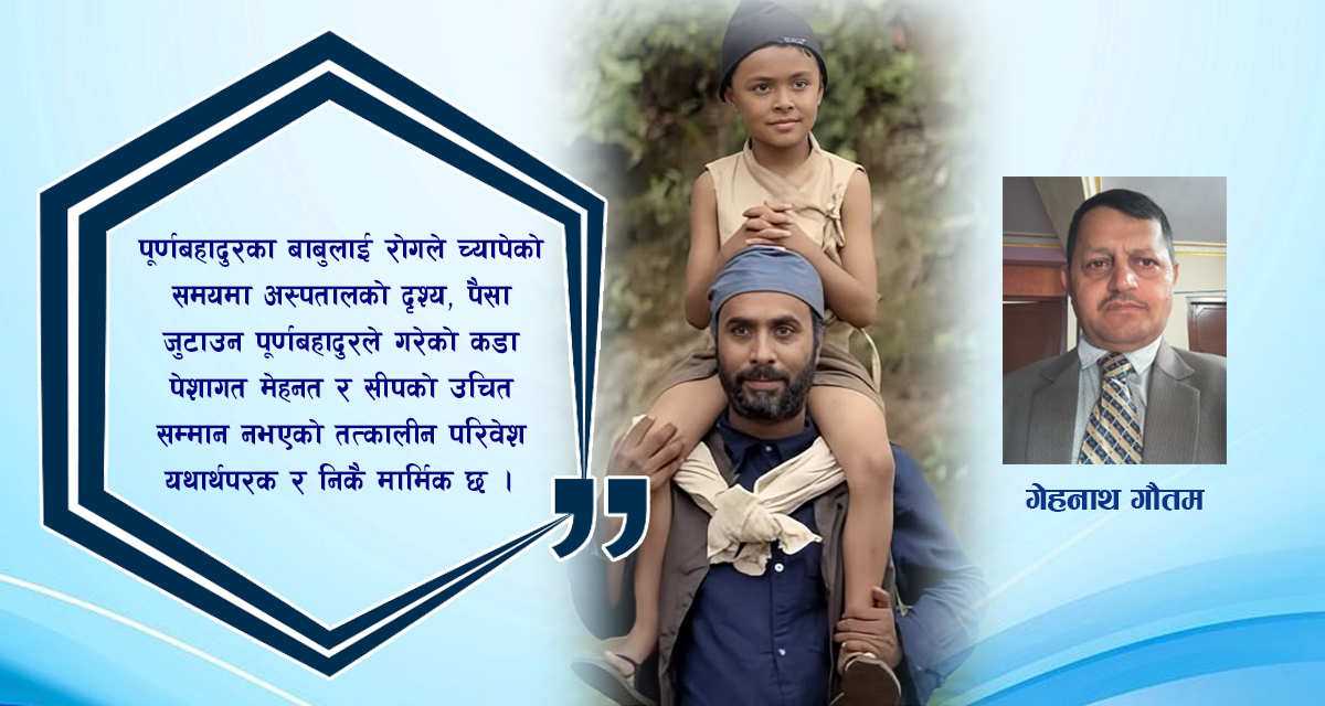 पूर्णबहादुरका बाबुलाई रोगले च्यापेको समयमा अस्पतालको दृश्य, पैसा जुटाउन पूर्णबहादुरले गरेको कडा पेशागत मेहनत र सीपको उचित सम्मान नभएको तत्कालीन परिवेश यथार्थपरक निकै मार्मिक छ।
