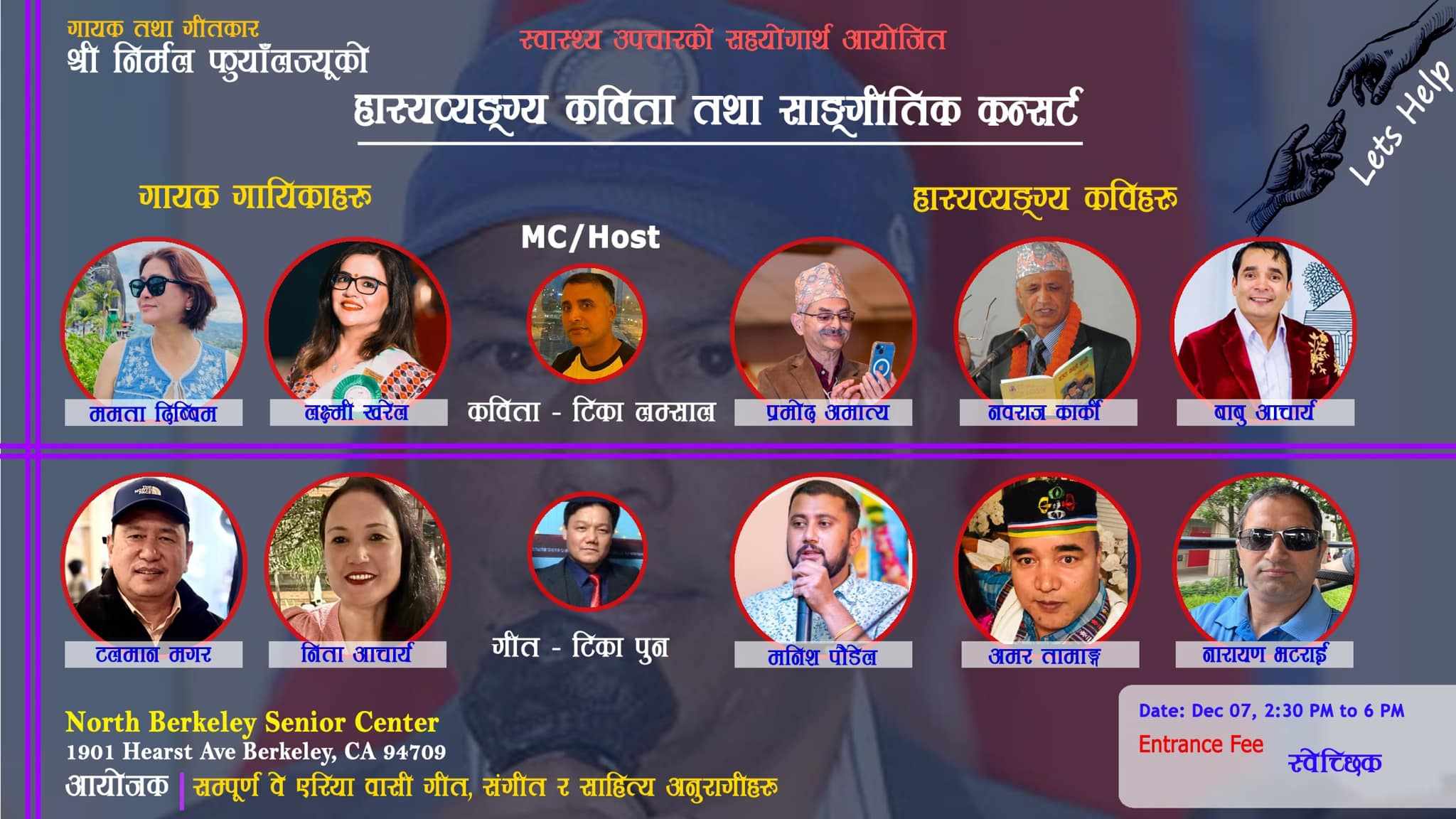 क्यालिफोर्निया। क्यालिफोर्नियामा यही डिसेम्बर महिनाको ७ तारिकमा पहिलो पटक हास्यव्यङ्ग्य कविता तथा सांगीतिक कन्सर्टको आयोजना गरिएको छ।