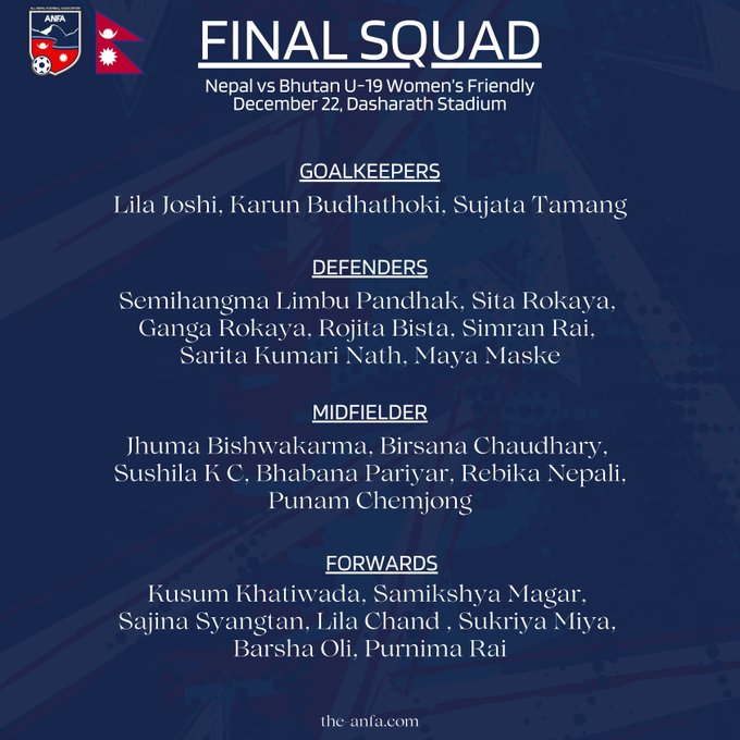 काठमाडौं। भुटानसँग हुने मैत्रीपूर्ण खेलका लागि नेपालको यु–१९ महिला टोली घोषणा गरिएको छ। अखिल नेपाल फुटबल संघ (एन्फा) ले सोमबार टोलीमा सामेल हुने खेलाडीको नाम घोषणा गरेको हो।