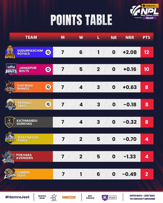 उता, लिग चरणको अन्तिम खेलमा सुदूरपश्चिमसँग पराजित भए पनि कर्णाली याक्सले रन रेटका आधारमा प्लेअफमा स्थान बनाउने टोलीमा गनिएको छ। जसअनुसार ४ खेलमा जितसहित चितवन राइनोज तेस्रो र समान ४ जितसहित कर्णाली चौथो स्थानमा रहँदै प्लेअफको यात्रामा रहेका छन्।
