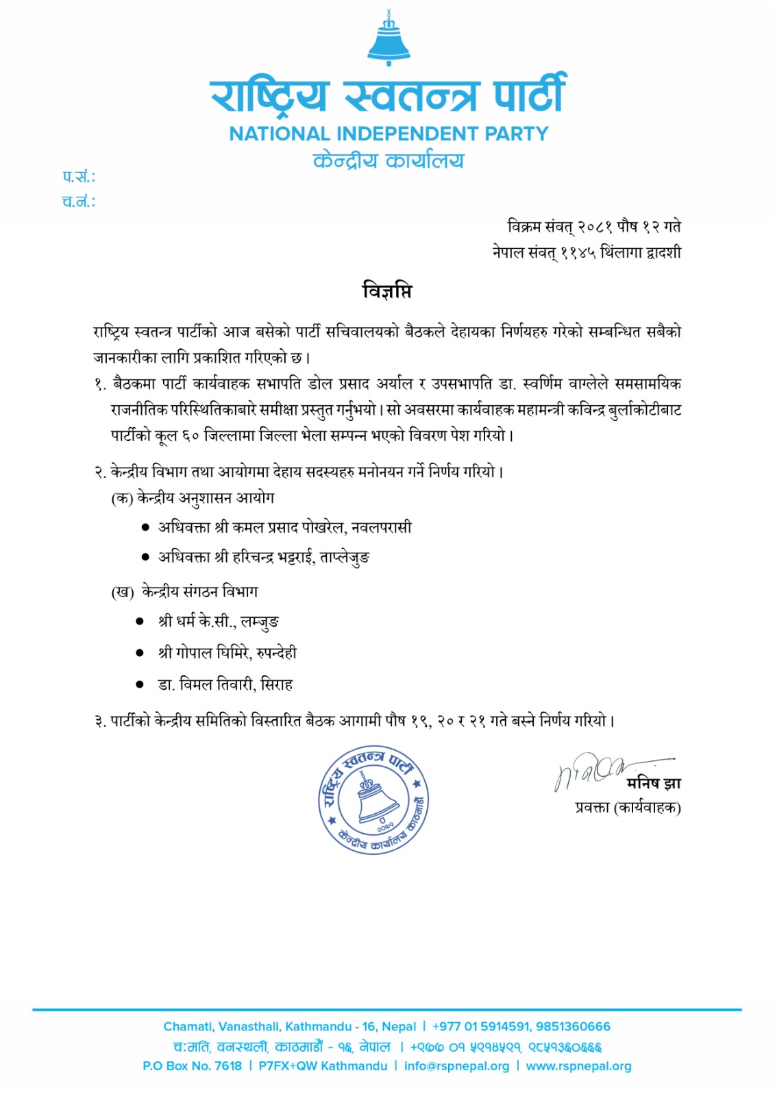 साथै शुक्रबार बसेको राष्ट्रिय स्वतन्त्र पार्टी (रास्वपा) को सचिवालय बैठकमा पार्टीका कार्यवाहक सभापति डोल प्रसाद अर्याल र उपसभापति डा. स्वर्णिम वाग्लेले समसामयिक राजनीतिक परिस्थितिकाबारे समीक्षा प्रस्तुत गरेका छन्।