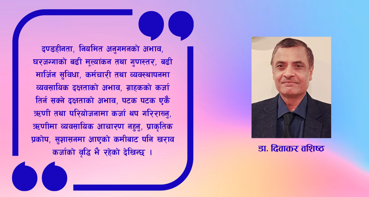 दण्डहीनता, नियमित अनुगमनको अभाव, घरजग्गाको बढी मूल्यांकन तथा गुणस्तर, बढी मार्जिन सुविधा, कर्मचारी तथा व्यवस्थापनमा व्यवसायिक दक्षताको अभाव, ग्राहकको कर्जा तिर्न सक्ने दक्षताको अभाव, पटक पटक एकै ऋणी तथा परियोजनामा कर्जा थप गरिराख्नु, ऋणीमा व्यवसायिक आचारण नहुनु, प्राकृतिक प्रकोप, शुसाशनमा आएको कमीबाट पनि खराव कर्जाको वृद्धि भै रहेको देखिन्छ।
