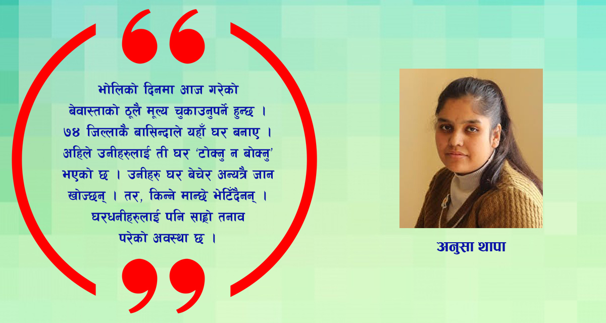 विडम्बनापूर्ण कुरा के भने जनता पनि कहिल्यै सचेत बनेनन्। ठूल्ठूला घरको बोझ यहाँको जमिनले धान्न सक्छ? सोच्दै नसोचिकन धमाधम घर बनाए। घर बनाउँदा मापदण्डसमेत पालना गर्दैनन्, घरधनी। आफ्नो कमाइका लागि घरधनीले भाडावालको ज्यान जोखिममा पारिरहेका छन्।