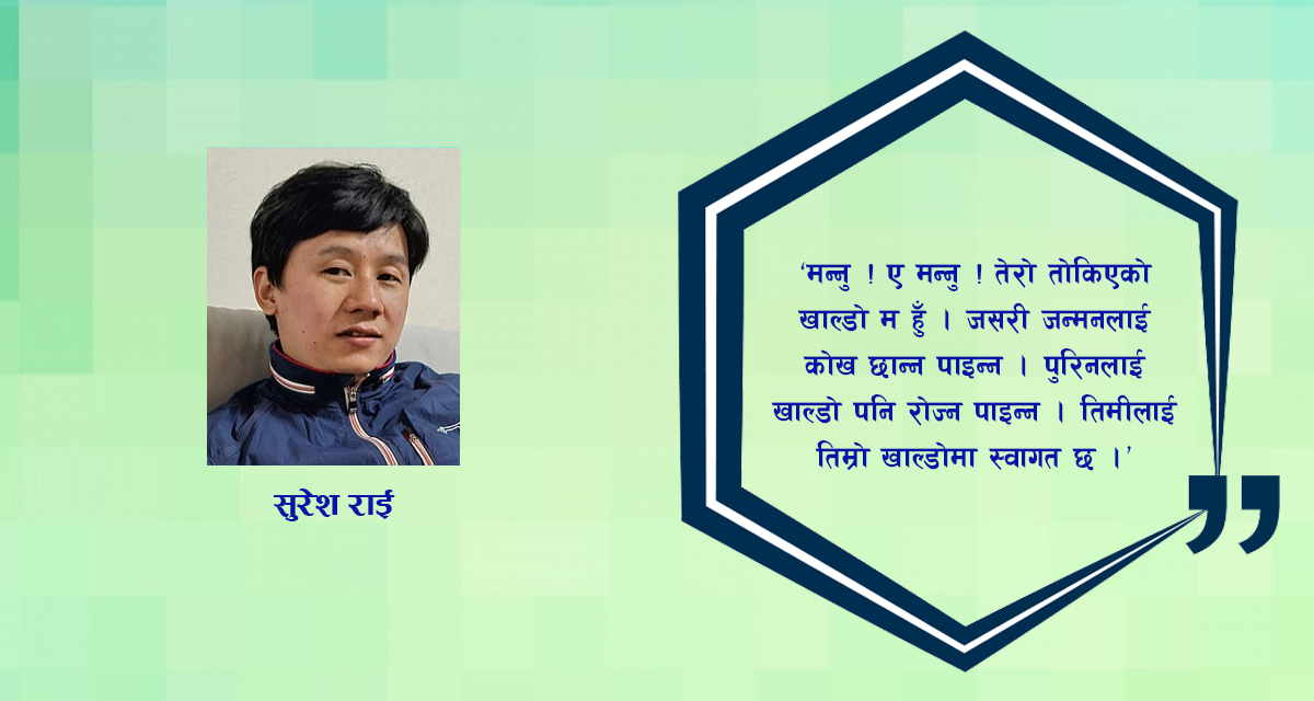 ‘मन्नु ! ए मन्नु! तेरो तोकिएको खाल्डो म हुँ। जसरी जन्मनलाई कोख छान्न पाइँन्न। पुरिनलाई खाल्डो पनि रोज्न पाइन्न। तिमीलाई तिम्रो खाल्डोमा स्वागत छ’