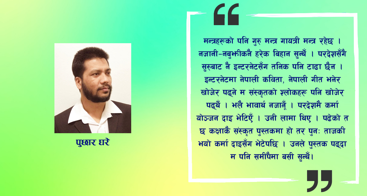 मन्त्रहरूको पनि गुरु मन्त्र गायत्री मन्त्र रहेछ। नजानी-नबुझीकनै हरेक बिहान सुन्थेँ । परदेशसँगै सुरुबाट नै इन्टरनेटसँग तनिक पनि टाढा छैन। इन्टरनेटमा नेपाली कविता, नेपाली गीत भनेर खोजेर पढ्ने म संस्कृतको श्लोकहरू पनि खोजेर पढ्थेँ।