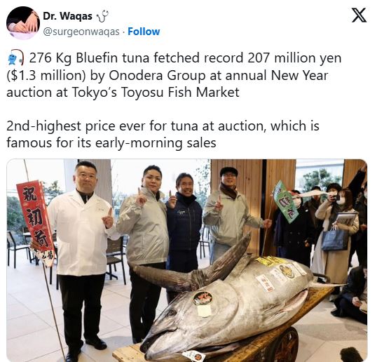 यो कीर्तिमान बोली जापानभर सुशी जान्माई रेष्टुरेन्ट चेन चलाउने ‘टुना किङ’ भनेर चिनिने कियोशी किमुराले लगाएका हुन्। यसअघि उनले २०१९ मा एक २७८ किलोग्राम ब्लूफिन टुनाका लागि सबैभन्दा उच्च लिलामी मूल्य ११४ मिलियन येनमा खरिद गरेका थिए।