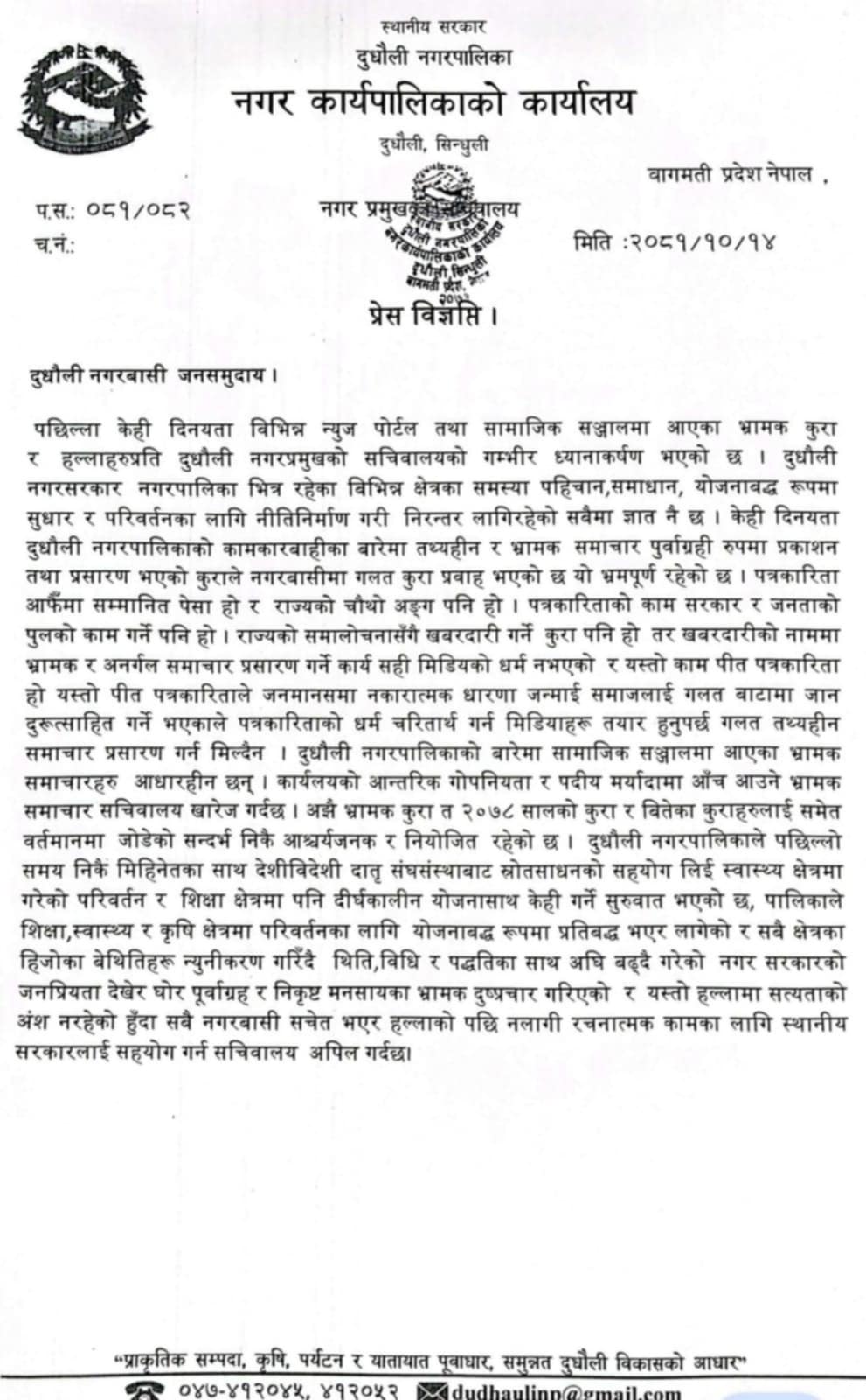 केही सञ्चार माध्यम र सामाजिक सञ्जालमा नगर प्रमुख अधिकारी र प्रमुख प्रशासकीय अधिकृत बिच द्वन्द बढेका कारण नगरपालिका प्रमुख प्रशासकीय अधिकृत बिहिन हुन पुगेको लगायतका समाचार सम्प्रेषण भएपछि प्रमुखकाे सचिवालयले साे समाचार तथ्यहिन र भ्रामक भएको बताएको हो ।