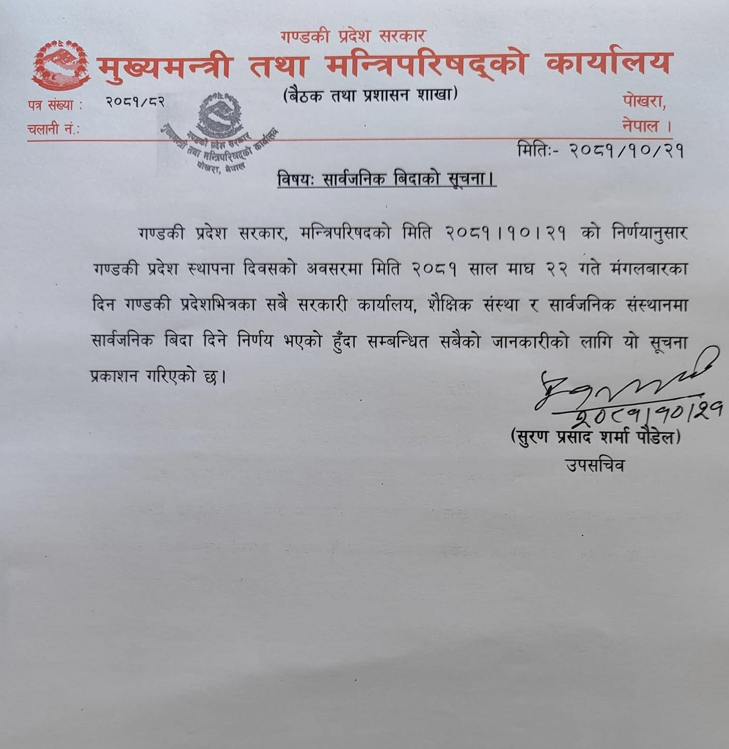 गण्डकी प्रदेश स्थापनाको अवसरमा सरकारले प्रदेशभर सार्बजनिक बिदा दिने निर्णय गरेको हो।