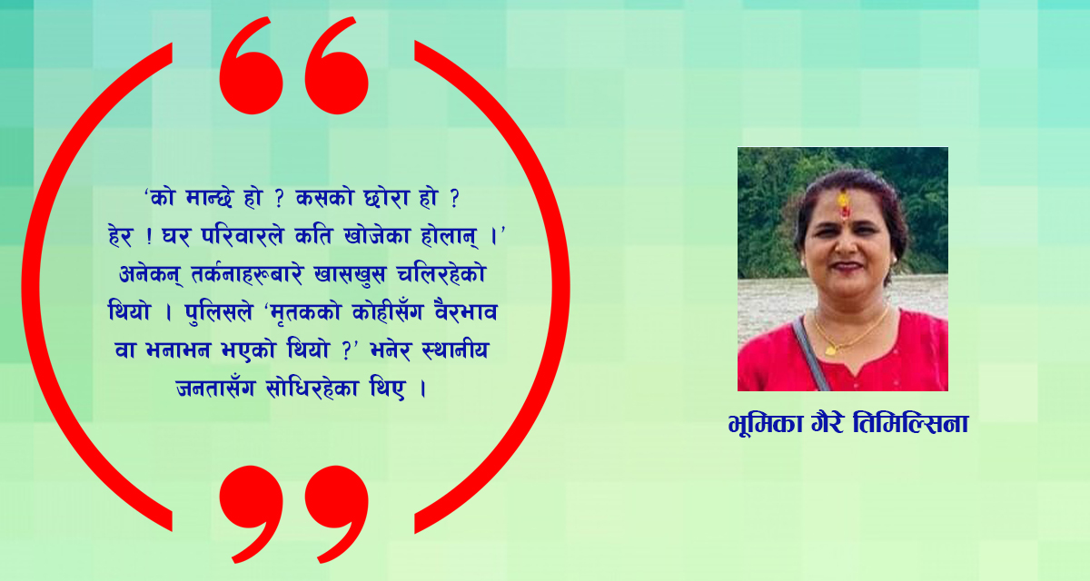 स्थानीय सुरेश भने मनमनै गुन्दै थिए , `आफ्नो जीवनभरि कमाएको पहिचान कतै त्यहीँ बोराभित्रको बेवारिसे शवमा टुङ्गिने त होइन ?”