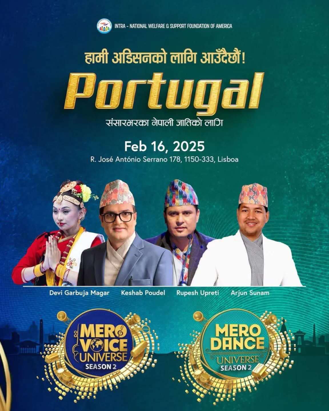 इन्टरनेशनल वेलफेयर एण्ड सपोर्ट फाउन्डेशन अफ अमेरिकाद्वारा आयोजित यस प्रतियोगितामा पोर्चुगलको लागि गायन र नृत्यतर्फ निर्णायकको भूमिका निर्वाह गर्न सुनाम, केशव पौडेल, रुपेश उप्रेती, र देवी गर्वुजा बुधवार लिस्बन आइपुगेका हुन्।