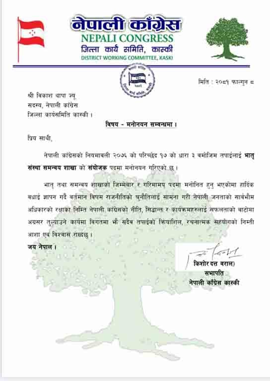 कांग्रेस कास्कीका सभापति किशोर दत्त बरालद्वारा हस्ताक्षरित पत्रमा नेपाली कांग्रेसको नियमवली २०७६ को परिच्छेद १७ को धारा ३ बमोजिम मनोनयन गरेको जनाइएको छ।