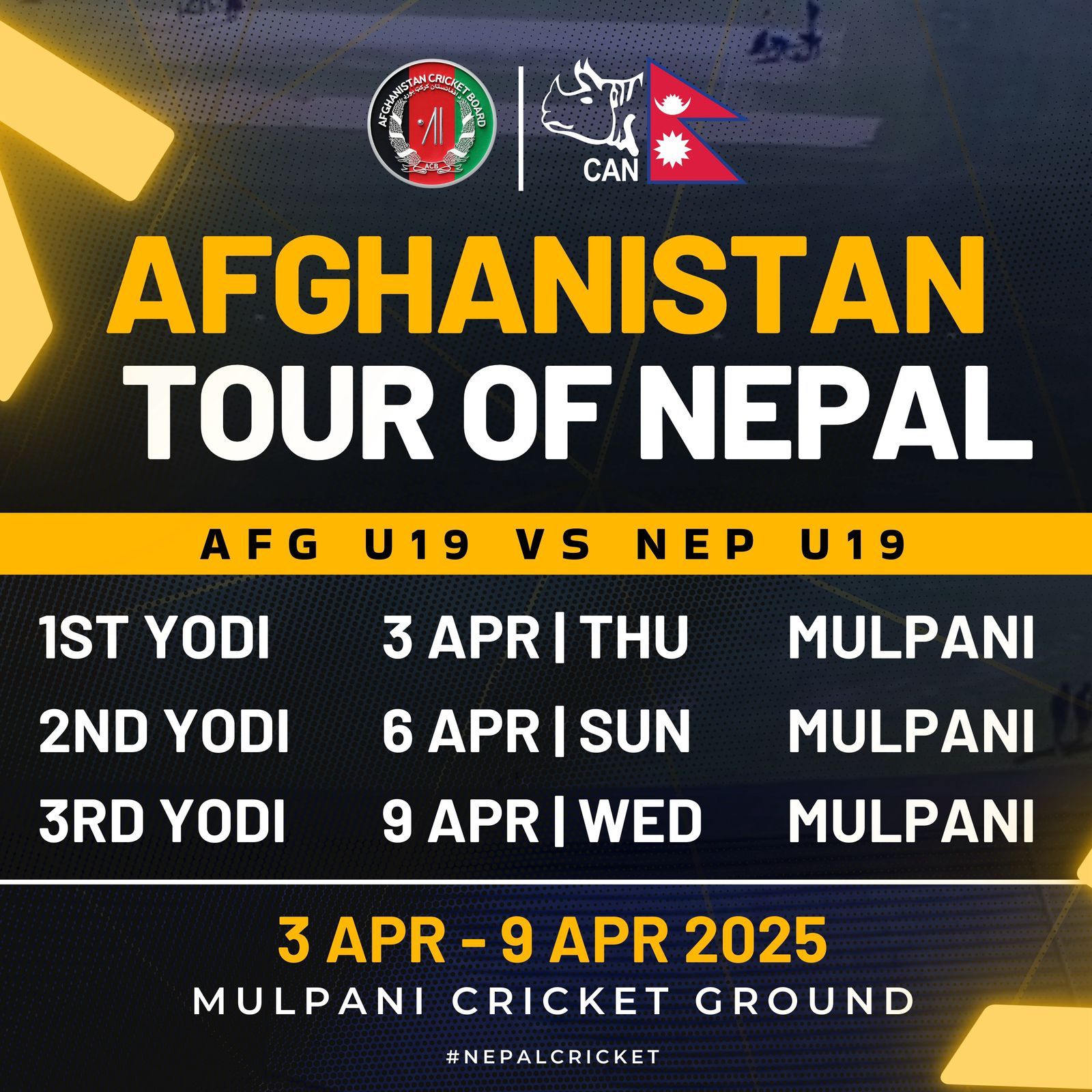 नेपाल क्रिकेट संघ (क्यान)का अनुसार अफगानिस्तानको यू-१९ टिमले नेपाली युवा टिमसँग तीन खेलको सिरिज खेल्ने छ। अप्रिल ३, ६ र ९ मा मुलपानी क्रिकेट मैदानमा खेल हुने क्यानले जानकारी दिएको छ।
