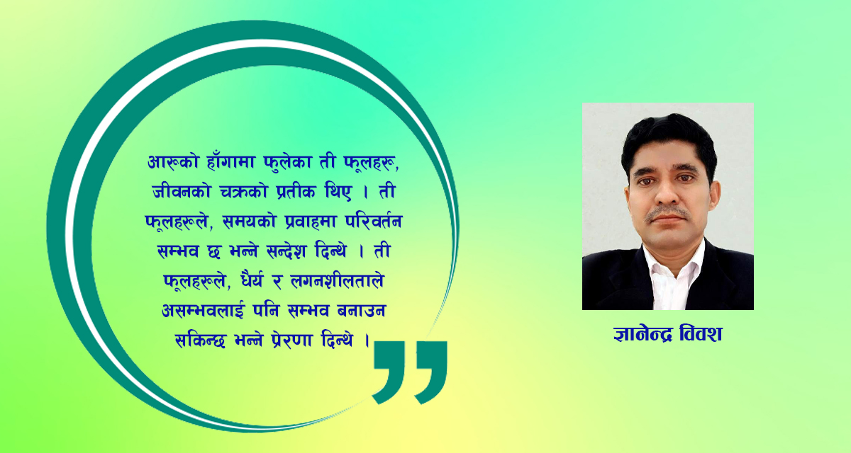 ती फूलहरू, जीवनको क्षणभंगुरताको साक्षी। तिनीहरूले देखाए-कसरी सुन्दरता क्षणिक हुन्छ, कसरी जीवनको हरेक पल परिवर्तनशील हुन्छ ? ती फूलहरूले सिकाए- कसरी जीवनको हरेक चरणलाई स्वीकार गर्नुपर्छ, कसरी हरेक अनुभवलाई आत्मसात् गर्नुपर्छ ? र, तिनैले सिकाए– कसरी जीवनलाई जीवनमय गतिमा गतिमान राखी सफलता भेट्न सकिन्छ भनेर।