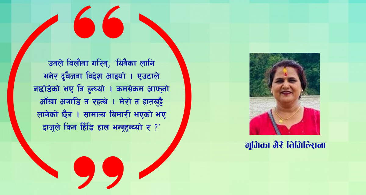 उनले विलौना गरिन्,’ यिनैका लागि भनेर दुबैजना विदेश आइयो। एउटाले नछोडेको भए नि हुन्थ्यो। कमसेकम आफ्नो आँखा अगाडि त रहन्थे। मेरो त हातखुट्टै लागेको छैन। सामान्य बिमारी भएको भए दाजुले किन हिँडि हाल भन्नुहुन्थ्यो र?’