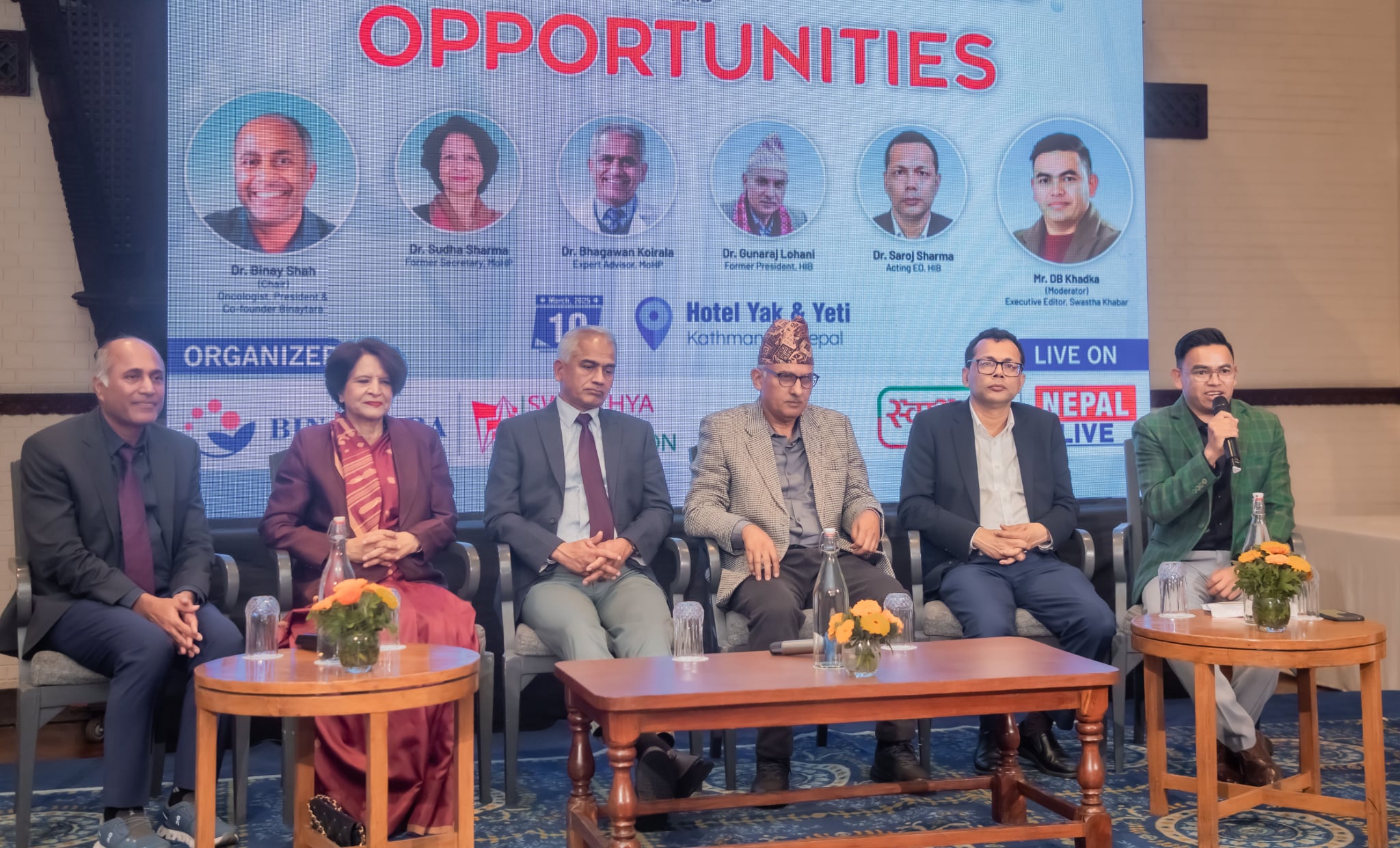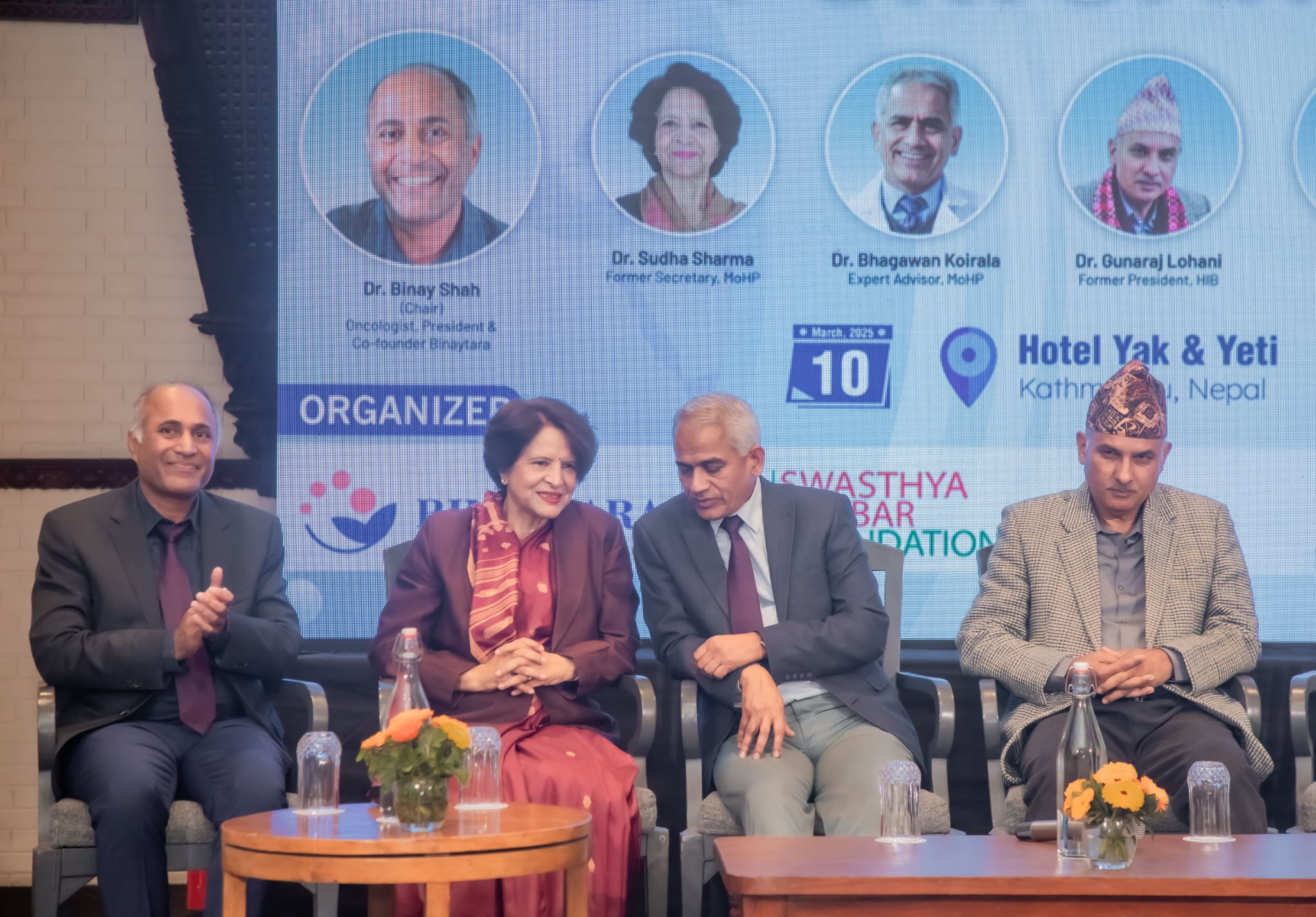अहिलेको ३५ सय रुपैयाँ तिरेर एक लाख रुपैयाँ बराबरको उपचार सेवा पाउने प्रणालीबाट अघि बढ्नुपर्ने अन्तरक्रियामा सहभागी डा भगवान कोइराला, डा गुणराज लोहनी, डा सुधा शर्मा र डा सरोज शर्माको जोड छ।