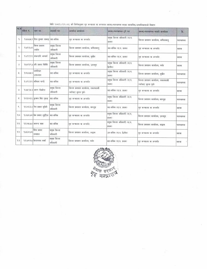 गृह मन्त्रालयका अनुसार सहसचिव दिलकुमार तामाङ कपिलवस्तु, भविश्वर पाण्डे नवलपरासी पूर्व, कुमानसिंह गुरुङ बागलुङ, प्रेमप्रसाद लुइटेल उदयपुर, आनन्द सारु अछामको प्रमुख जिल्ला अधिकारीमा सरुवा भएका छन्।