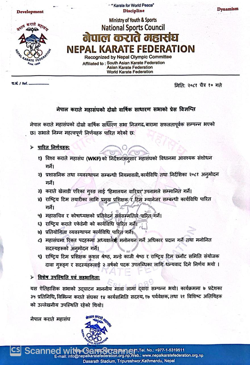 सभाले महासचिव र कोषाध्यक्षको प्रस्तुत गरेको प्रतिवेदन समेत सर्वसम्मतिबाट पारित गरिएको छ । महासंघका अध्यक्ष युवराज लामाले भावी योजना, तर्जुमा कार्यक्रम र रणनैतिक योजनाहरु सहित कराते खेलले हाशिल गरेको उपलब्धिहरु सबैको योगदानले प्राप्त भएको बताए ।