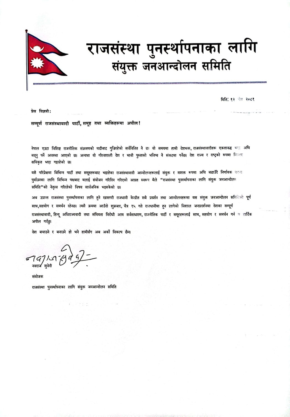 ‘आउँदो शुक्रबार राजधानीमा हुन लागेको विशाल जनप्रदर्शनमा देशका सम्पूर्ण राजसंस्थावादी, हिन्दू अधिराज्यवादी तथा संघीयताविरोधी आम सर्वसाधारण राजनीतिक पार्टी र समूहहरुलाई साथ, सहयोग र समर्थन गर्न म हार्दिक अपील गर्छु । देश बचाउने र बनाउने हो भने हामीसँग अब अर्को विकल्प छैन’, विज्ञप्तिमा भनिएको छ ।