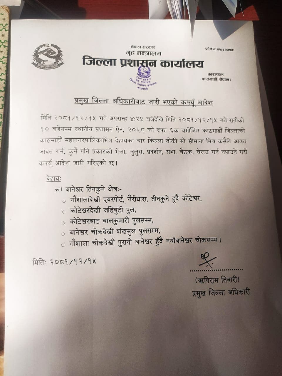 गौशालादेखी एयरपोर्ट, गैरीधारा, तीनकुने हुँदै कोटेश्वर, कोटेश्वरदेखि जडिबुटी पुल, कोटेश्वरबाट बालकुमारी पुलसम्म, बानेश्वरदेखि शंखमुल पुलसम्म र गौशाला चोकदेखि पुरानो बानेश्वर हुँदै नयाँ बानेश्वर चोकसम्म कर्फ्यु आदेश जारी गरिएको हो।