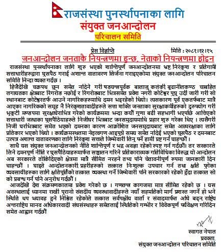 साथै, उनले राजसंस्था पुनर्स्थापनाका लागि शुरु भएको शान्तिपूर्ण जनआन्दोलनमा सत्ताधारीहरुबाट घुसपैठ भएको दाबी गरेका छन् । आजको सम्पूर्ण घटनाको जिम्मेवारी सरकारले लिनुपर्ने समितिको माग छ।