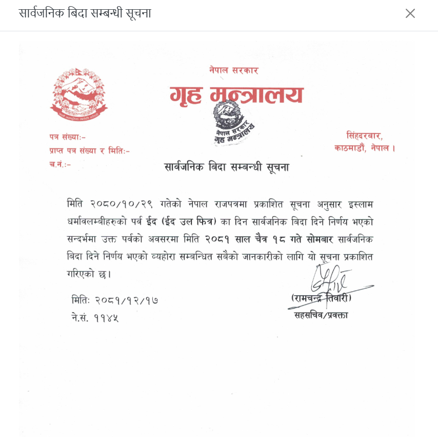 “‘मिति २०८०/१०/२९ गतेको नेपाल राजपत्रमा प्रकाशित सूचना अनुसार इस्लाम धर्मावलम्बीहरुको पर्व ईद (ईद उल फित्र) का दिन सार्वजनिक बिदा दिने निर्णय भएको सन्दर्भमा उक्त पर्वको अवसरमा मिति २०८१ साल चैत्र १८ गते सोमबार सार्वजनिक बिदा दिने निर्णय भएको व्यहोरा सम्बन्धित सबैको जानकारीको लागि गरिएको छ,” गृह मन्त्रालयद्वारा जारी सुचनामा भनिएको छ।