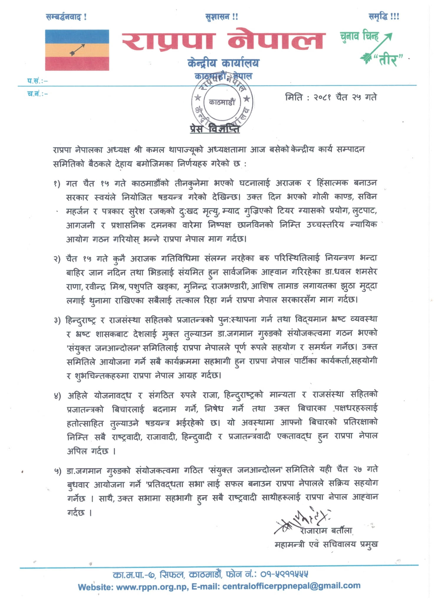 चैत १५ गतेको घटनामा उच्चस्तरीय न्यायिक आयोग गठन गर्न राप्रपा नेपालको माग