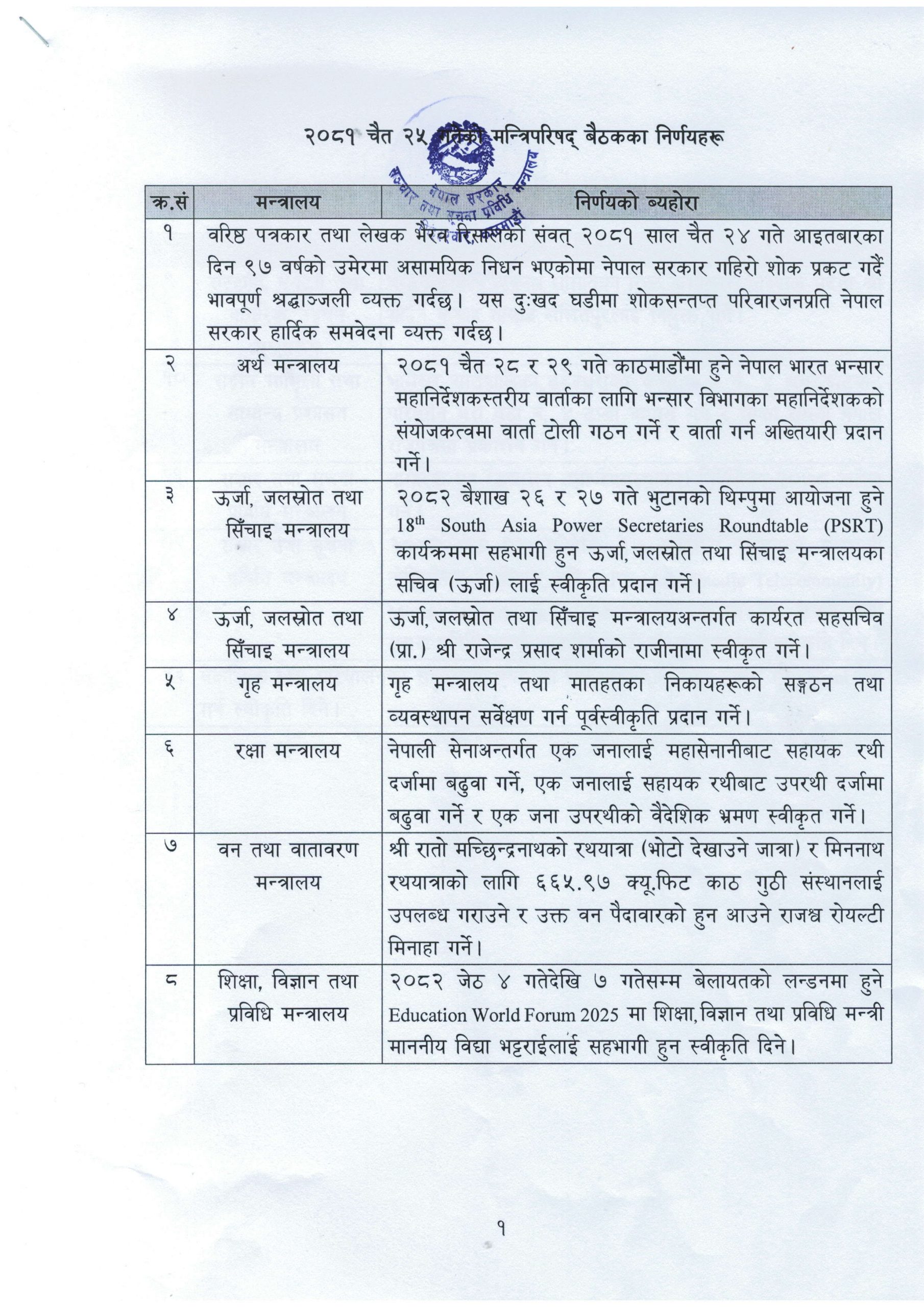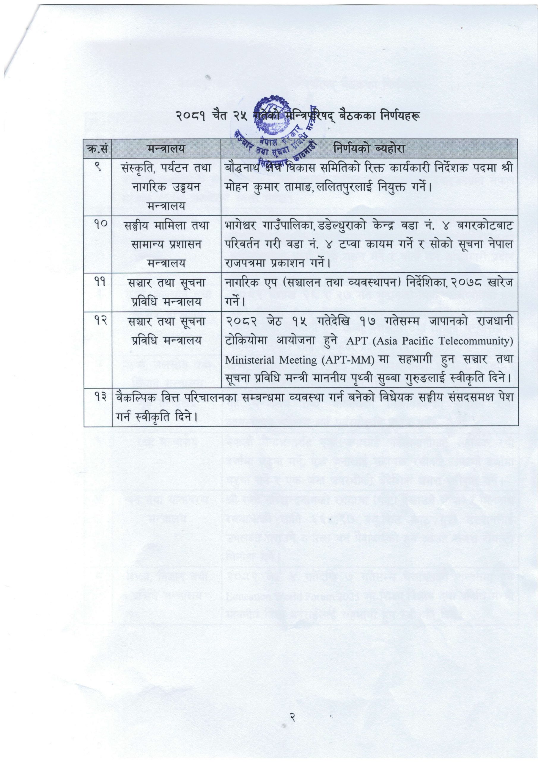 त्यस्तै बैठकले नेपाल भारत भन्सार महानिर्देशकस्तरीय वार्ताका लागि भन्सार विभागका महानिर्देशकको संयोजकत्वमा वार्ता टोली गठन गरेको छ भने बौद्धनाथ क्षेत्र बिकास समितिको रिक्त कार्यकारी निर्देशक पदमा मोहन कुमार तामाङलाई नियुक्त गरिएको प्रवक्ता गुरुङले बताए।