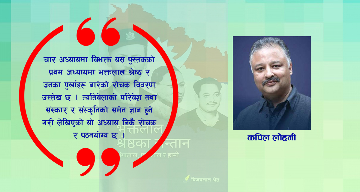 चार अध्यायमा विभक्त यस पुस्तकको प्रथम अध्यायमा भक्तलाल श्रेष्ठ र उनका पुर्खाहरू बारेको रोचक विवरण उल्लेख छ। त्यतिबेलाको परिवेश तथा संस्कार र संस्कृतिको समेत ज्ञान हुने गरी लेखिएको यो अध्याय निकै रोचक र पठनयोग्य छ।