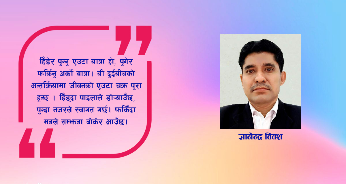 हिँडेर पुग्नु एउटा यात्रा हो, पुगेर फर्किनु अर्को। यी दुईबीचको अन्तरक्रियामा जीवनको एउटा चक्र पूरा हुन्छ। हिँड्दा पाइलाले डो¥याउँछ, पुग्दा नजरले स्वागत गर्छ, र फर्किँदा मनले सम्झना बोकेर आउँछ।