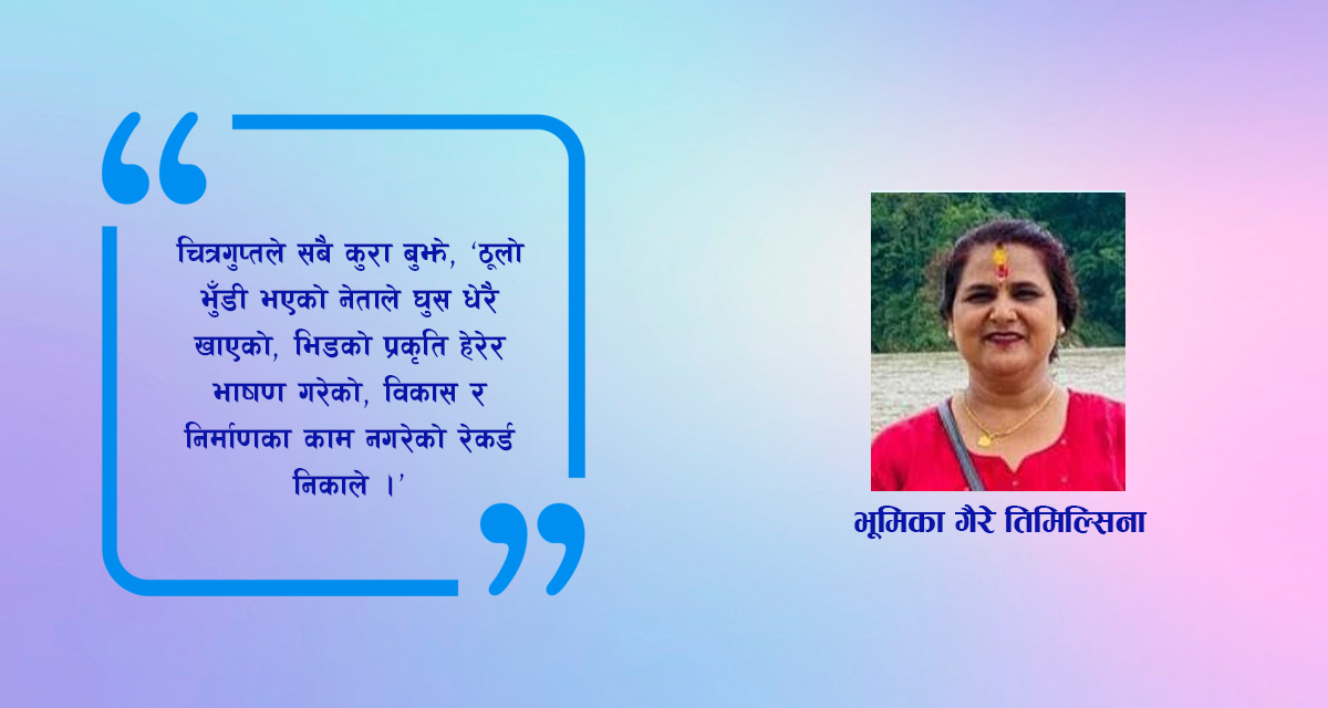 चित्रगुप्तले सबै कुरा बुझे, “ठूलो भुँडी भएको नेताले घुस धेरै खाएको, भिडको प्रकृति हेरेर भाषण गरेको, विकास र निर्माणका काम नगरेको रेकर्ड निकाले। ”