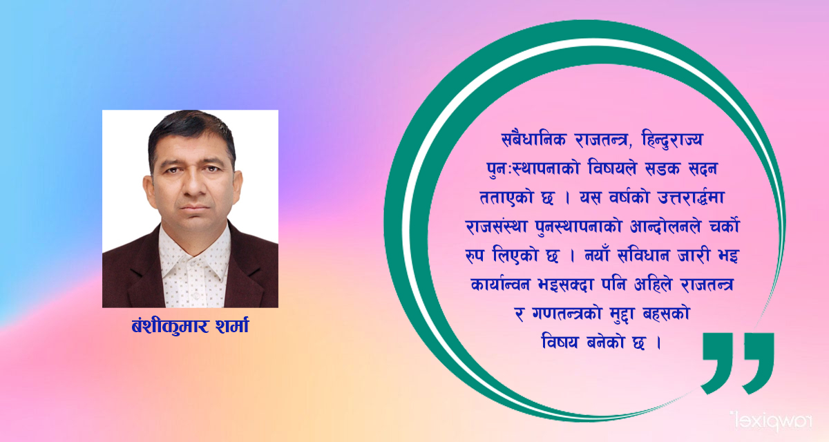संबैधानिक राजतन्त्र, हिन्दुराज्य पुनःस्थापनाको विषयले सडक सदन तताएको छ। यस वर्षको उत्तराद्र्धमा राजसंस्था पुनस्थापनाको आन्दोलनले चर्काे रुप लिएको छ। नयाँ संविधान जारी भइ कार्यान्वन भइसक्दा पनि अहिले राजतन्त्र र गणतन्त्रको मुद्दा बहसको विषय बनेको छ।