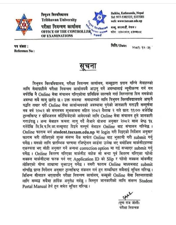 साथै, आगामी जेठ १५ गतेदेखि भने परीक्षा नियन्त्रण कार्यालय बल्खुबाट दिइने सम्पूर्ण सेवा अनलाइनबाट सञ्चालन गरिने छ।