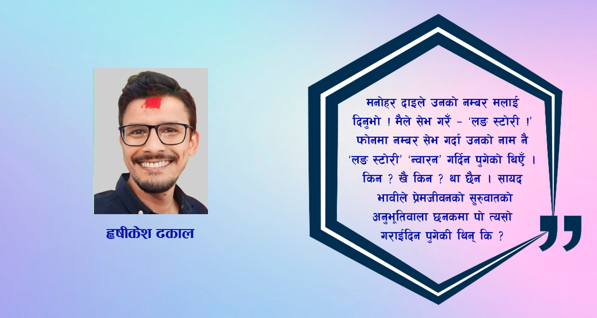 फोनमा नम्बर सेभ गर्दा उनको नाम नै ‘लङ स्टोरी’ ‘न्वारन’ गर्दिन पुगेको थिएँ। किन? खै किन?! था छैन। सायद भावीले प्रेमजीवनको सुरुवातको अनुभूतिवाला छनकमा पो त्यसो गराईदिन पुगेकी थिन् कि?!