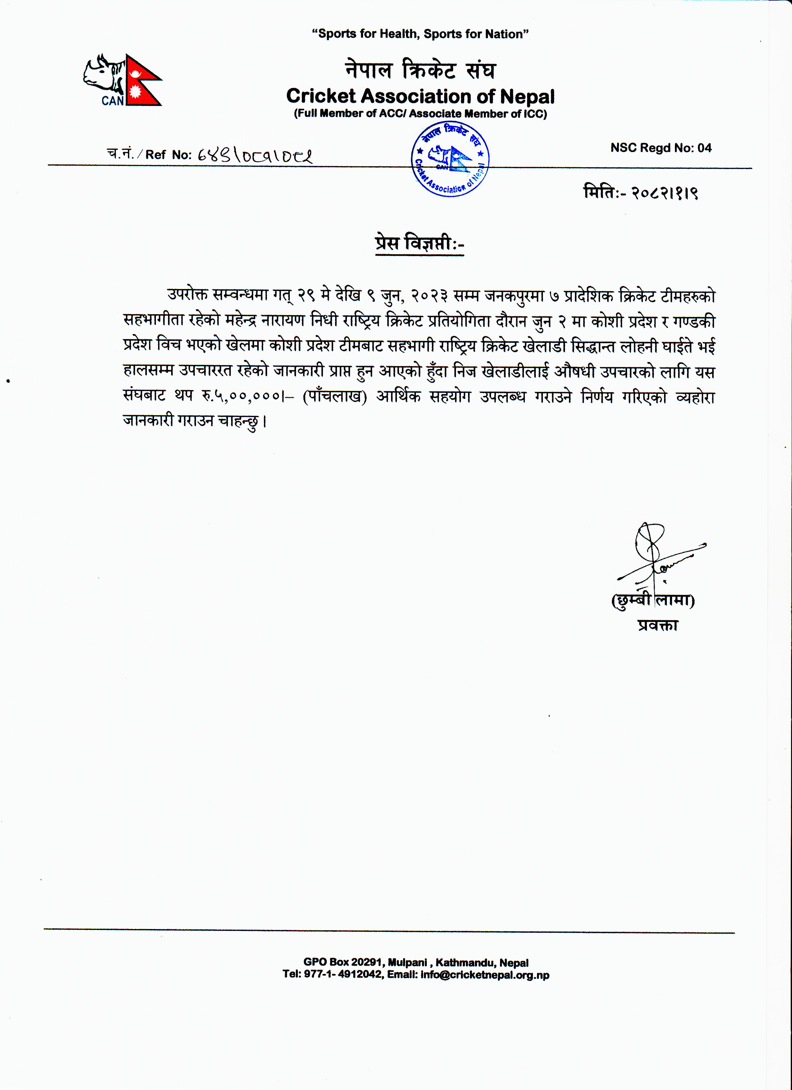 काठमाडौं। नेपाल क्रिकेट संघ (क्यान)ले क्रिकेट खेलाडी सिद्धान्त लोहनीको उपचारका लागि रु पाँच लाख सहयोग गर्ने भएको छ।