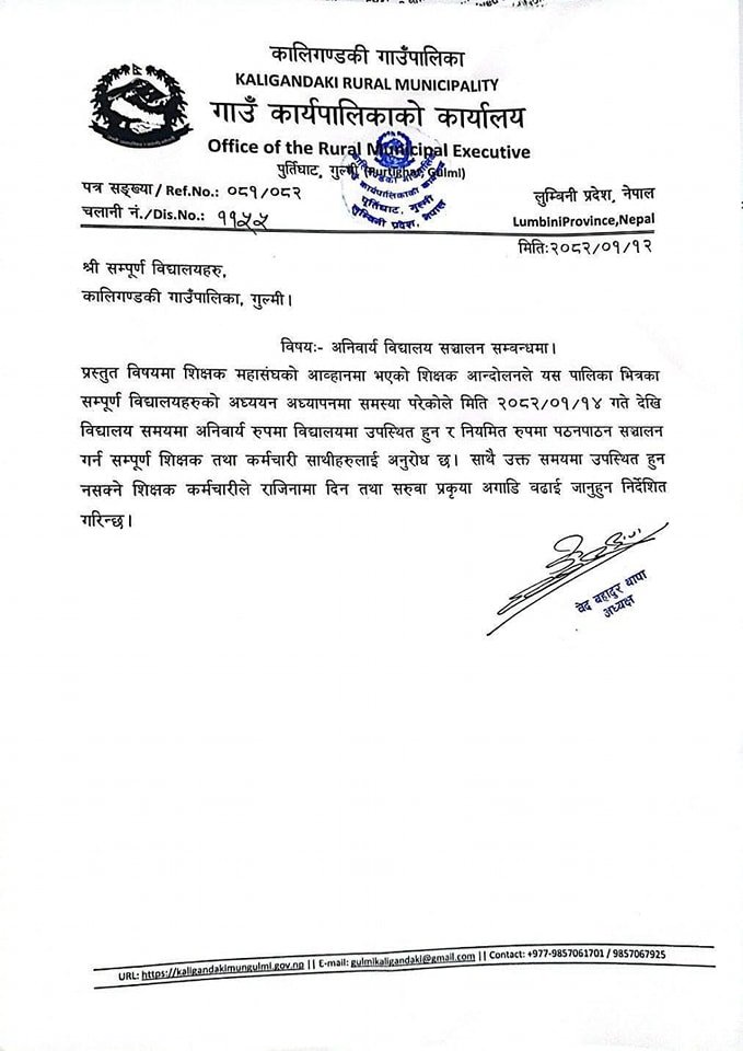 गुल्मीको कालिगण्डकी गाउँपालिकाले शिक्षकहरूलाई १४ गतेदेखि अनिवार्य रूपमा विद्यालयमा उपस्थित हुन निर्देशन दिँदै उक्त चेतावनी दिएको हो।