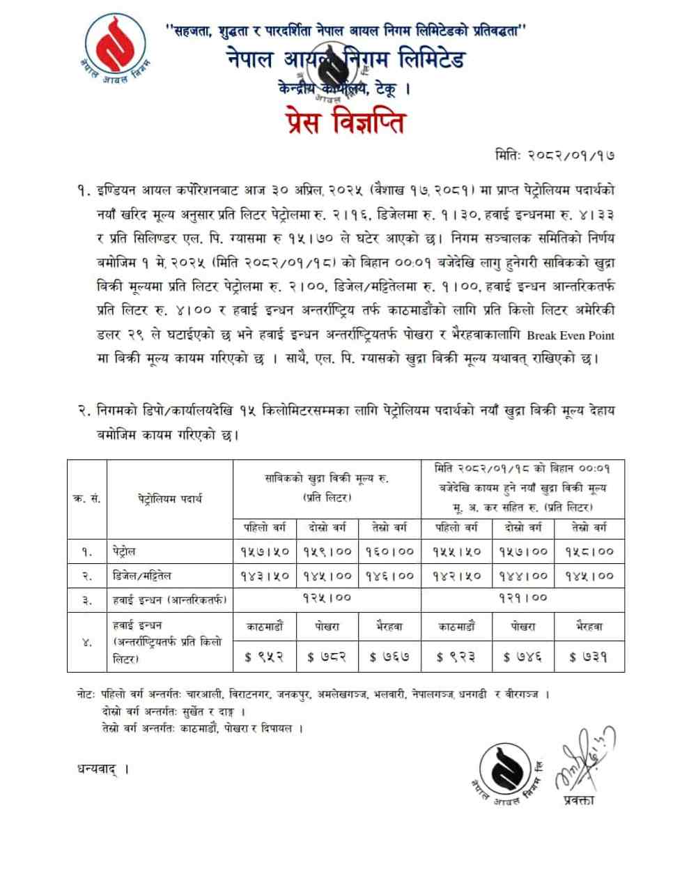 निगमले इण्डियन आयल कर्पोरेशनबाट पेट्रोल, डिजेल र मट्टितेलको मूल्य घटेर आएकाले मूल्य समायोजन गरिएको जनाएको छ। निगमका अनुसार पेट्रोलमा प्रतिलिटर २ रुपैयाँ तथा डिजेल र मट्टितेलमा १ रुपैयाँले मूल्य घटाइएको छ।