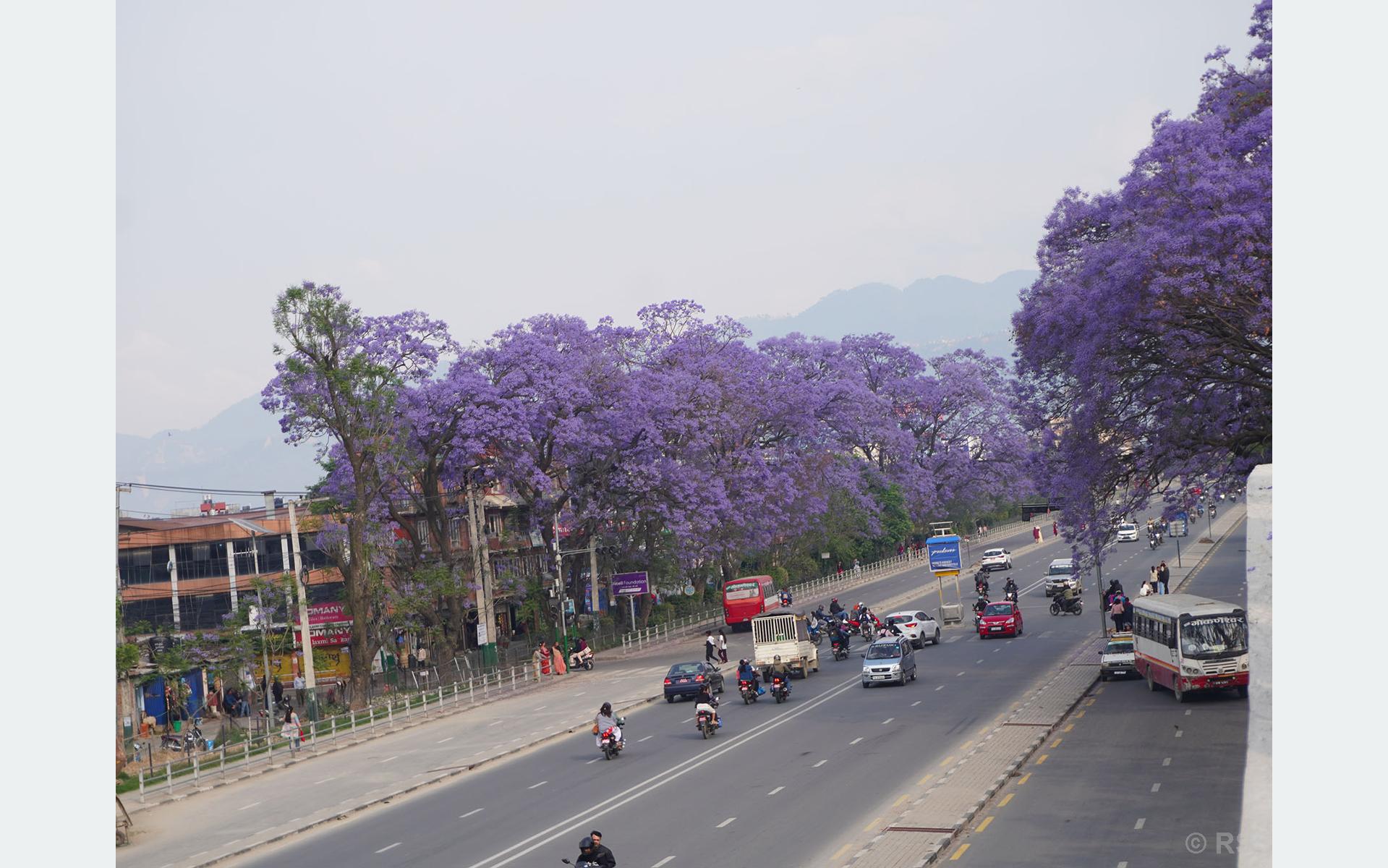 ललितपुर । ललितपुर महानगरपालिका–१४ स्थित चक्रपथ वरपर वैजनी रङको जाकाराण्डा फूल ढपक्क फुलेको छ। वसन्त ऋतुमा फूल्ने यस फूलले यहाँको शोभा बढाएको छ। अचेल दिनहुँजसो फूल र चक्रपथलाई पृष्ठभूमिमा राखेर तस्बिर र भिडियो खिच्ने युवायुवतीको उपस्थिति झनै हेर्न लायक हुन्छ।