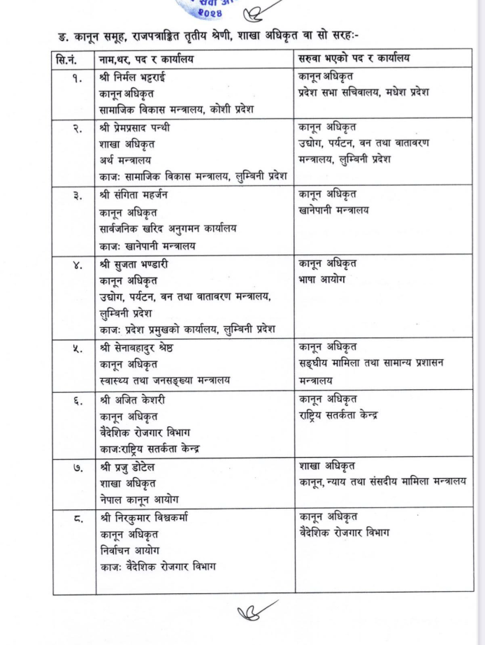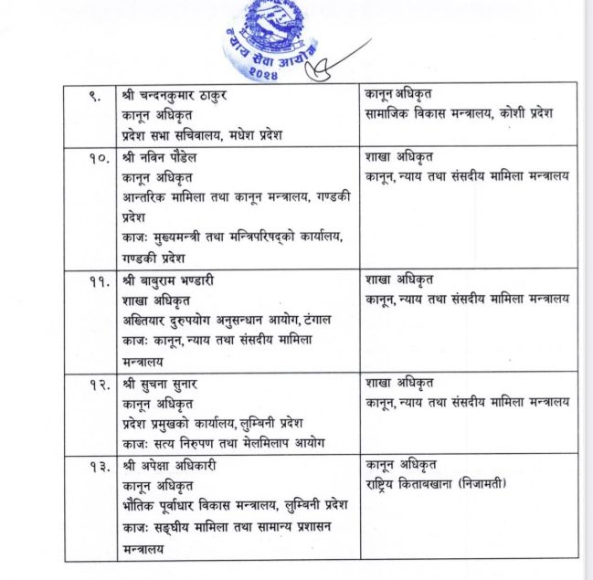 काठमाडौं । १३ जना अधिकृतको सरुवा गरिएको छ । न्याय सेवा आयोगले कानुन समूहका राजपत्राङ्कित तृतीय श्रेणीका शाखाहरूको सरुवा गरेको हो।