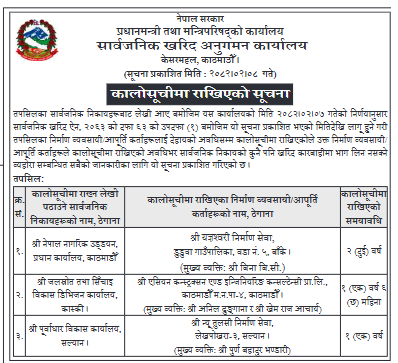 काठमाडौं। तीन वटा निर्माण व्यवसायी तथा आपूर्तिकर्ताहरू कालोसूचीमा परेका छन्। सार्वजनिक खरिद अनुगमनको कार्यालयले सूचना जारी गरी विभिन्न निकायहरुको सिफारिसमा ती निर्माण व्यवसायी र आपूर्तिकर्तालाई कालोसूचीमा राखेको हो।