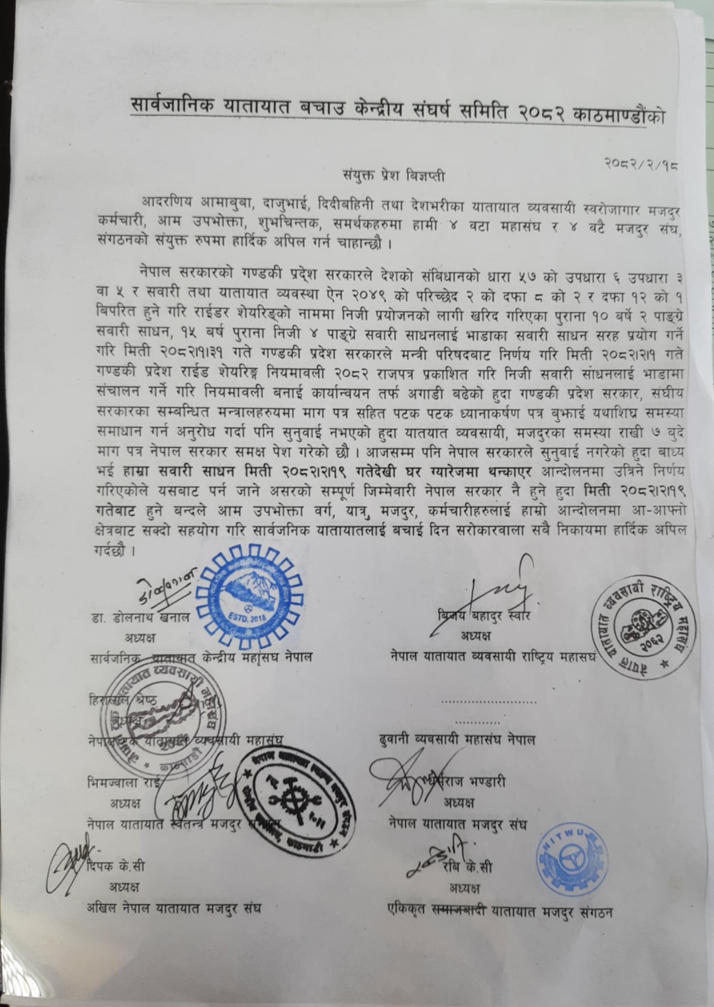 गण्डकी प्रदेश सरकारले नियमावली नै जारी गरेर राइड सेयरिङका नाममा नीजि सवारी साधनलाई पनि यात्रु ओसारपसारमा प्रयोग गर्न दिने वैधानिक व्यवस्था मिलाएको भन्दै आन्दोलित व्यवसायीले मंगलबारदेखि सवारीसाधन घर, ग्यारेजमा थन्काएर सेवा ठप्प पार्ने घोषणा गरेका हुन्।