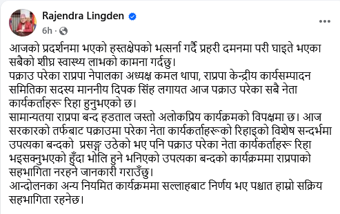 तर, पक्राउ परेका कुल आठ जनामध्ये कमल थापा र दीपकबहादुर सिंहसहित सात जनालाई भने अबेर साँझ रिहा गरिएको थियो। आफ्ना नेता तथा कार्यकर्ता रिहा भएपछि समितिले बन्दको कार्यक्रम फिर्ता लिने निर्णय गरेको हो।