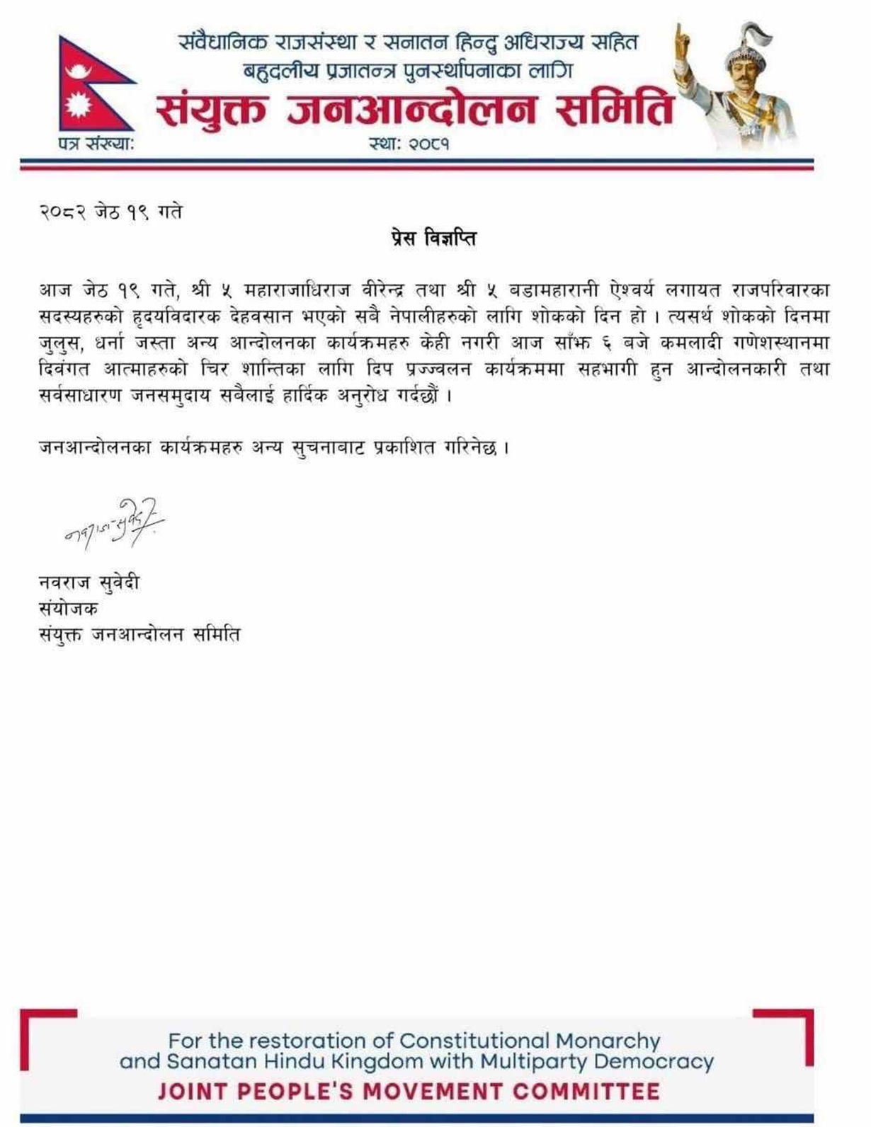 संयुक्त जनआन्दोलन समितिका संयोजक नवराज सुवेदीले विज्ञप्ति निकालेर दरबार हत्याकाण्डको शोकमा आन्दोलन नगर्ने निर्णय भएको बताएका हुन्।