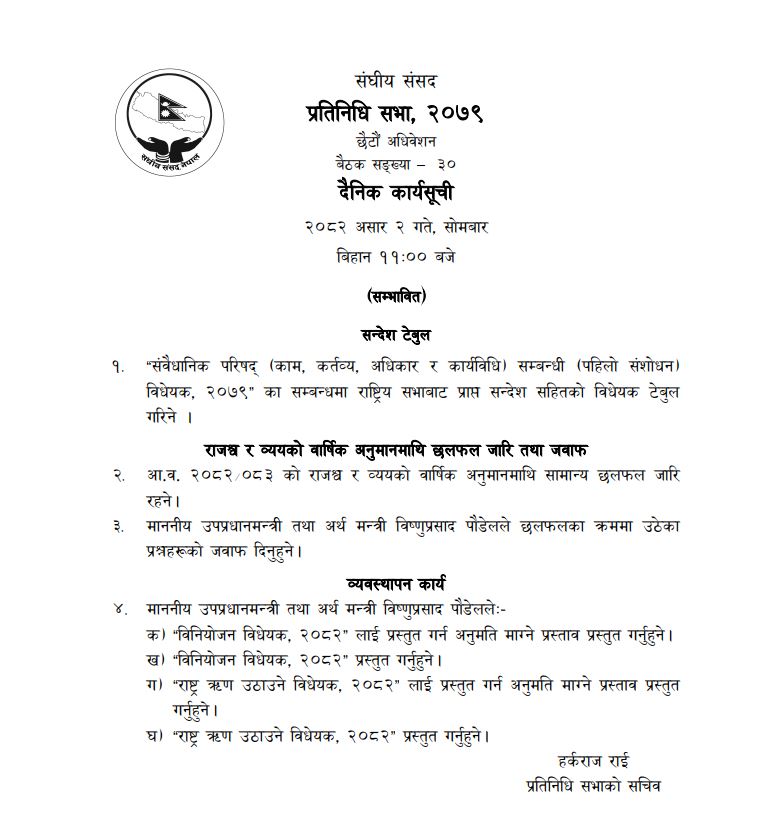 संघीय संसद् सचिवालयका अनुसार, अर्थमन्त्रीले ‘विनियोजन विधेयक, २०८२’ र ‘राष्ट्र ऋण उठाउने विधेयक, २०८२’ प्रस्तुत गर्ने कार्यसूची छ। यस्तै, अर्थमन्त्री पौडेलले आव २०८२-८३ को राजस्व र व्ययको वार्षिक अनुमानमाथि सांसदहरुले राखेको जिज्ञासाको जवाफ दिनेछन्।
